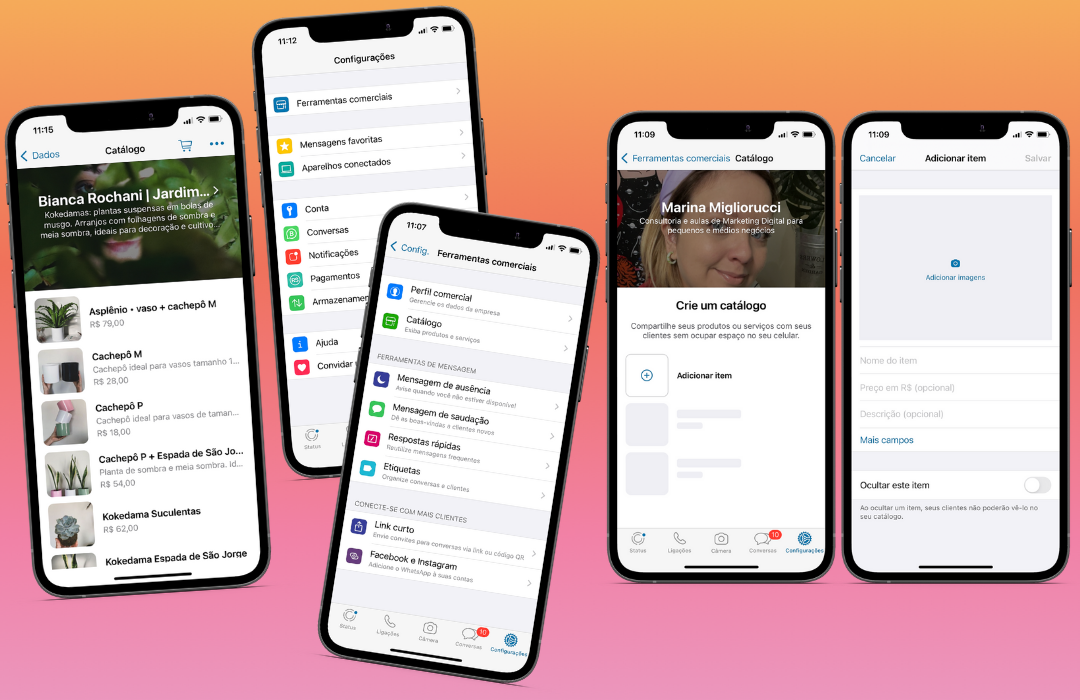 O catálogo de WhatsApp está disponível para contas do WhatsApp Business. Depois de fazer o download do aplicativo e inserir as informações necessárias, acesse a área de Configurações, clique em catálogo, toque em Adicionar Item e preencha as informações.