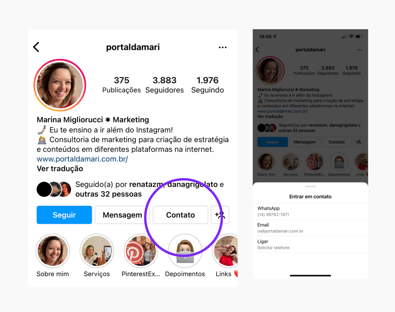 - Sobre você/Sobre a sua marca: fale sobre você e sobre a sua marca. Nesse espaço, é legal também colocar links rápidos para contato com você, endereço e até horário de funcionamento.