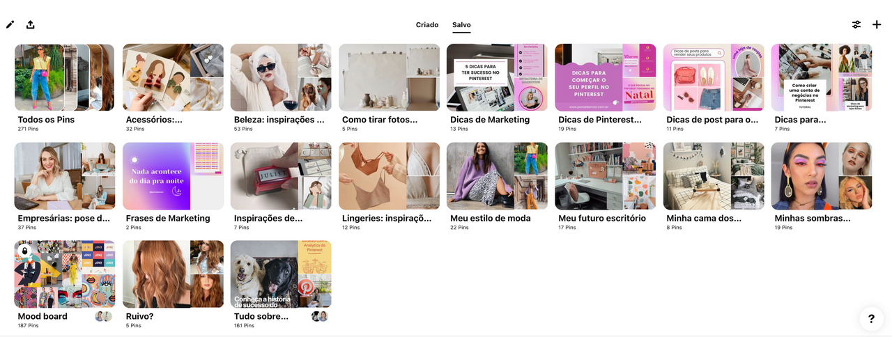 Você pode definir as pastas de acordo com o conteúdo que você irá publicar. No meu caso, além de falar sobre Marketing, eu também pino conteúdos de inspiração que eu sei que meus clientes podem gostar e também coisas que eu gosto de moda e beleza.
